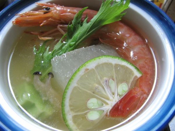 薄味の冷たい餡を張ってあって、レア状態の大きなナントカ海老が乗ってます。