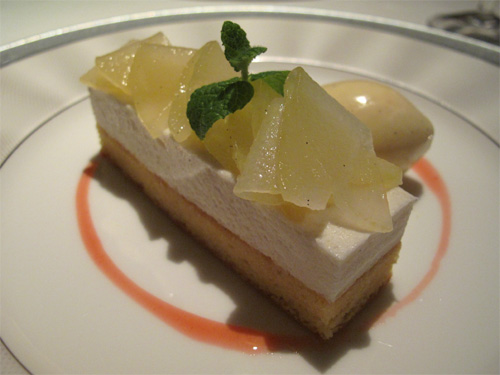 デザートは洋梨のコンポートがのったムースのケーキ。