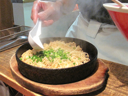 豚骨スープを吸った細麺は熱々の鉄板上でポキポキに変化します。
