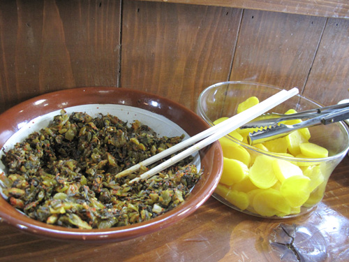 アタシの席の右手には辛子高菜と沢庵。