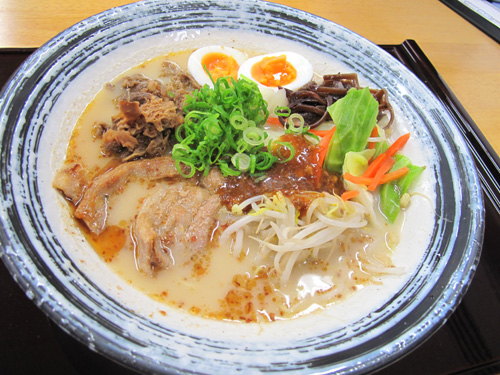 とんこつラーメンをベースに、阿蘇の赤牛や野菜を盛り込み、