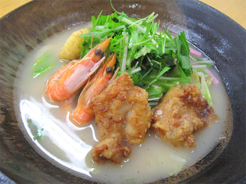 トッピングは「ふぐフライ」と「海老の素揚げ」です。