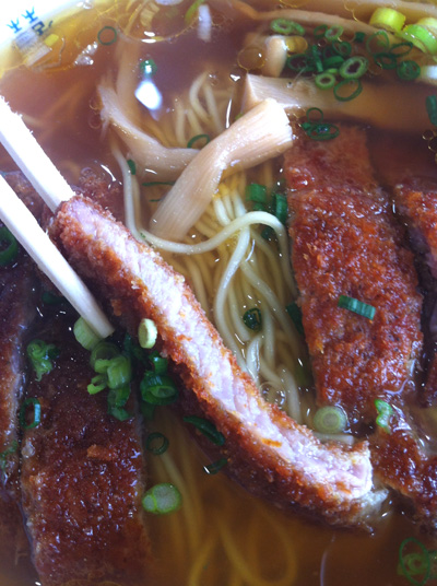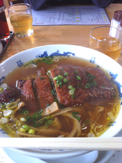 中華系のあっさり醤油味スープにパン粉揚げの豚肉、いわゆるトンカツが1枚のったもの。