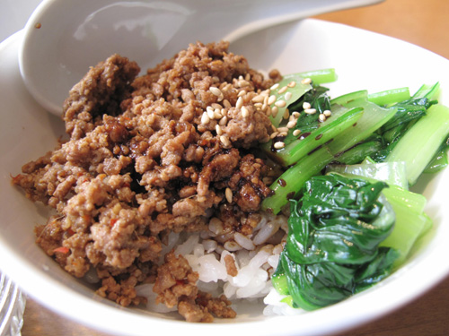 あっさり上品な印象の上湯麺にボリューム感をプラスする中華風のピリ辛そぼろ飯です。
