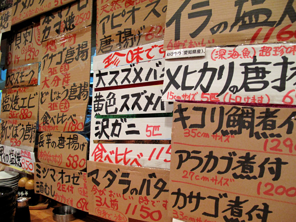 カウンター前の壁全体にびっちり貼ってあるダンボール紙の札に書かれたメニュー。