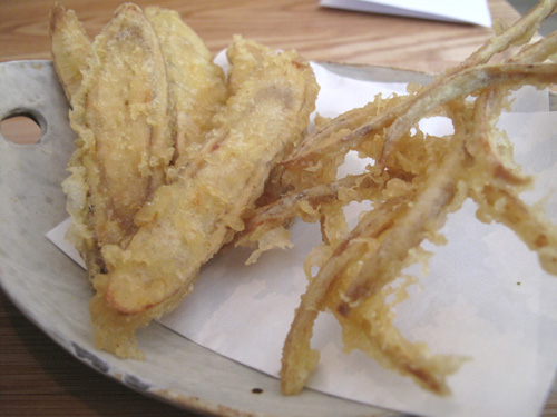 ごぼうの天ぷらは、斜め薄切りとかき揚げ状のものが2種類。