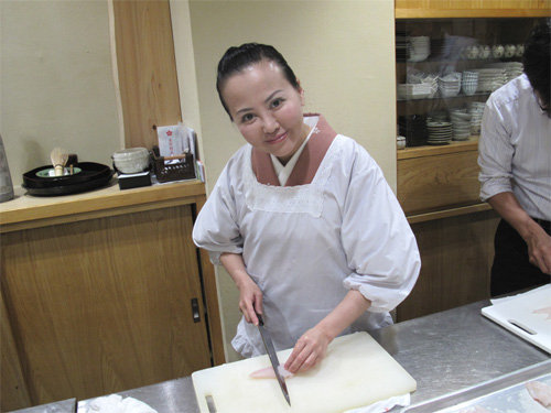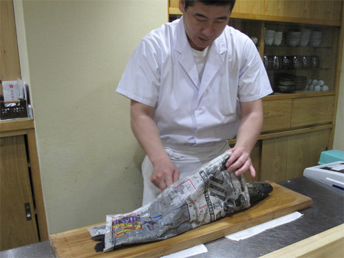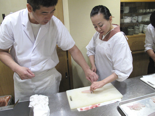 画像の下の写真は、大将が式包丁(まな板の上の魚や鳥に直接手を触れず、
