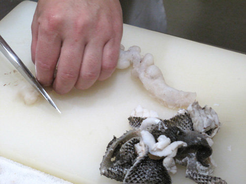 皮や浮き袋も湯引きして、一口大に切ります。
