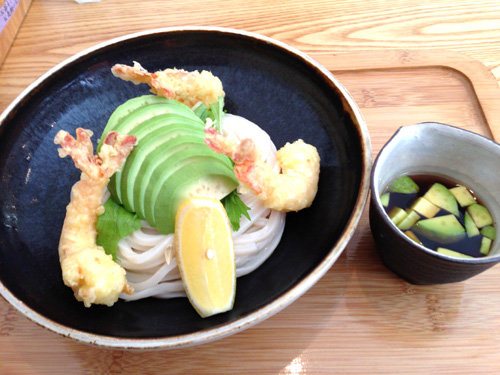 先日、アタシが食べた、うどん日和の定番・アボカドと海老天ぶっかけ650円。