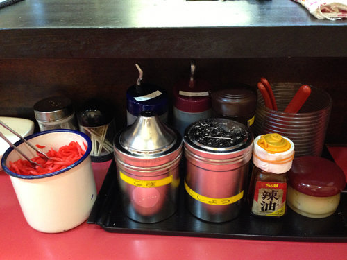 卓上には紅しょうがなど一般的なトッピングと調味料。
