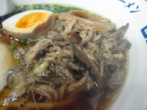 違いは、基本のチャーシュー1枚に、烏骨鶏肉のほぐし身が加わっていること。