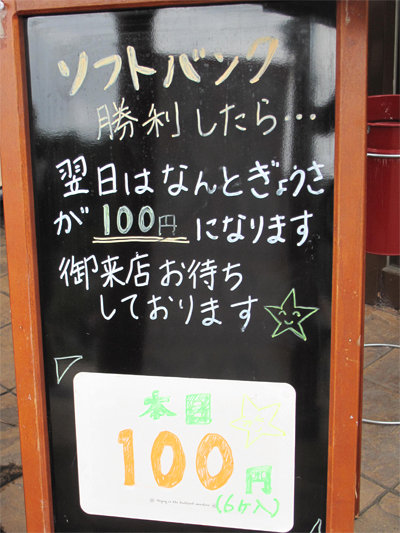 あ、そうそう、ソフトバンクホークスが勝った翌日は餃子が100円でした。