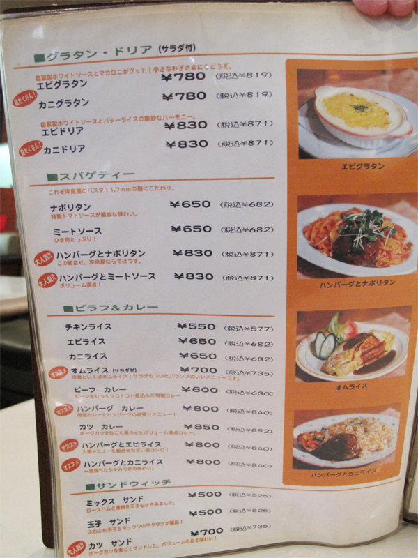 グラタン・ドリア・スパゲティ・ピラフ・カレー・サンドイッチのメニュー。