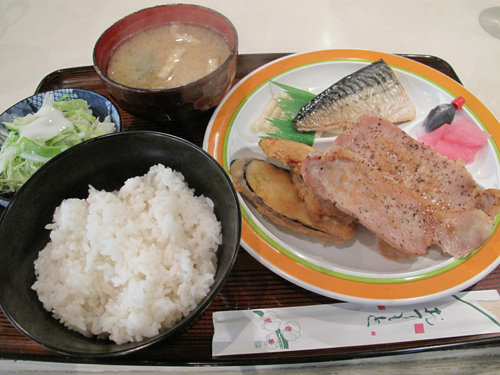 本日のおかずは、ポークステーキ2枚、大きめカットの野菜の天ぷら3切れ、