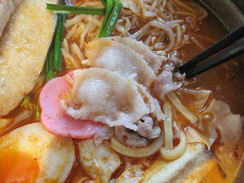 具は、薄揚げ・豚肉・ニラ・焼豆腐・キャベツ・もやし・かまぼこ・丸餅。