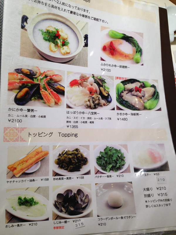 豪華な中華粥とトッピングメニュー。