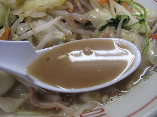 豚骨度は薄めで、香ばしい炒め野菜から出た出汁を含んだあっさりめの醤油味。