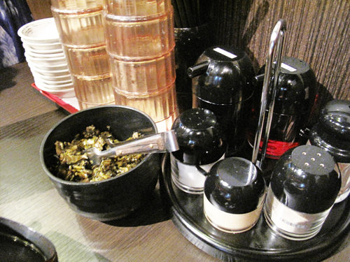 卓上の各種調味料とトッピング。