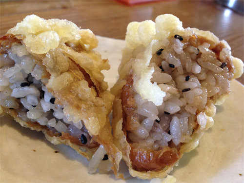 クリスピーな衣・甘辛い薄揚げの皮・黒ゴマ入りのプチプチ食感の酢飯。