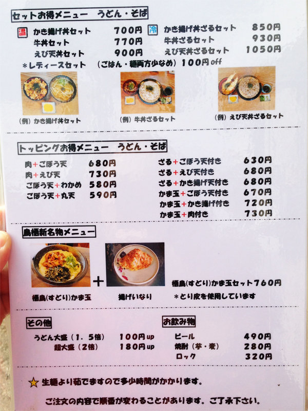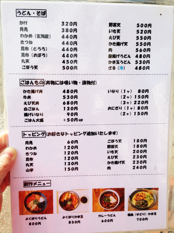 うどん・そば・御飯もの・トッピングのメニューです。