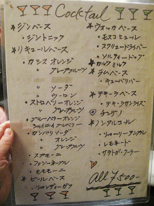 カクテルメニュー。