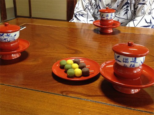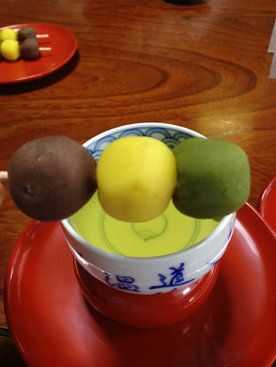 当時は、湯ざらし団子で、赤餡と白餡の団子を三つ串に刺したものだったそうです。