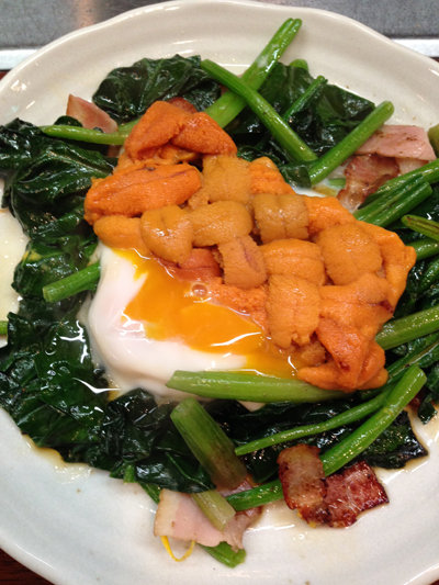 生のほうれん草とベーコンを炒めて、卵を落とし、生ウニ板1枚分をのせたものです。