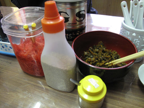 紅ショウガ・辛子高菜・粒ゴマ(スリゴマではない)・ニンニクペースト・コショウなどがあります。