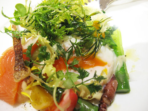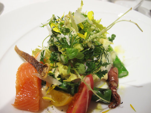 【前菜】宮崎産奥日向サーモンの桜コンフィーと福岡産グリーンアスパラガス