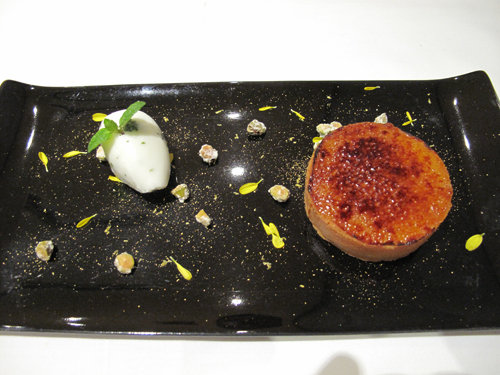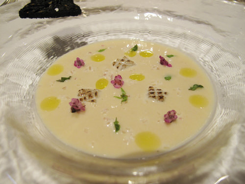 【前菜】長崎産新玉葱の冷製スープ アオリイカと花穂シソのアクセント