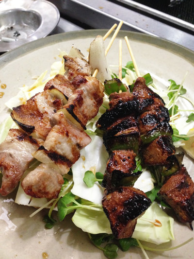 色々頼んだのですが、これは博多焼鳥の定番の豚バラとレバー。