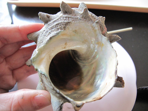 身を食べた後は、殻に残ったおつゆを啜ります。