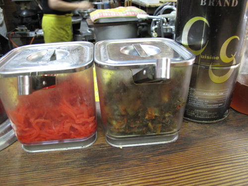 卓上には紅しょうがと辛子高菜があります。