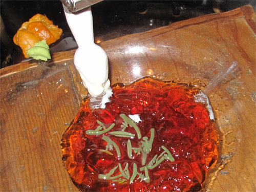 そして、セネガルマンが醤油ゼリーの上にウニーっと白いクリームを絞り出しました。
