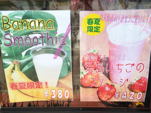 女子が好きそうな糸島イチゴやバナナのスムージーもあります。