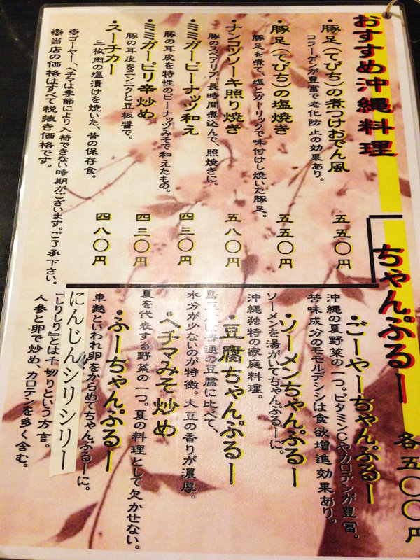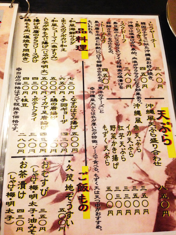 沖縄料理と居酒屋料理メニュー。