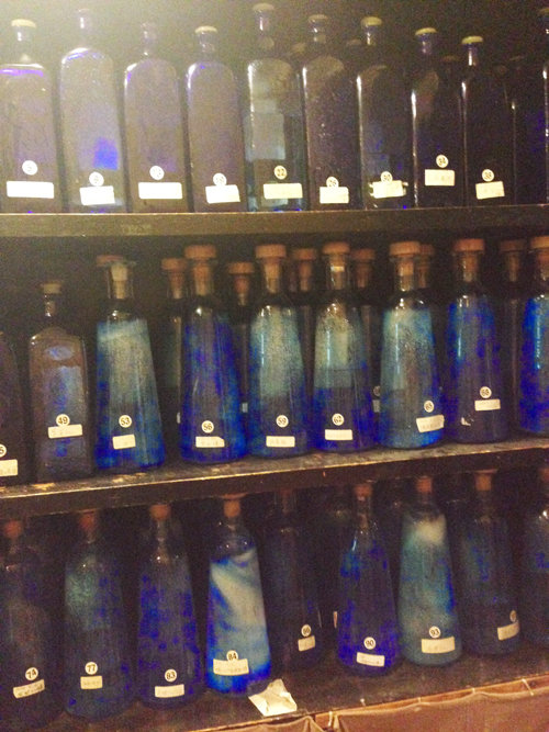 キープボトル棚には泡盛のキレイなブルーのガラス瓶が並んでます。