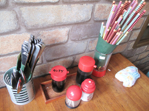 味が物足りない場合は、卓上にあるカラアゲ用ソースをかけて食べます。