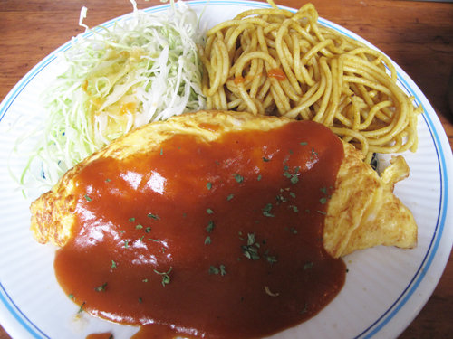 プレーンオムレツにゆるめのケチャップソースをかけてあります。