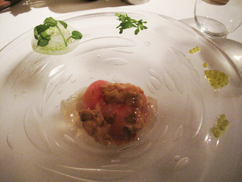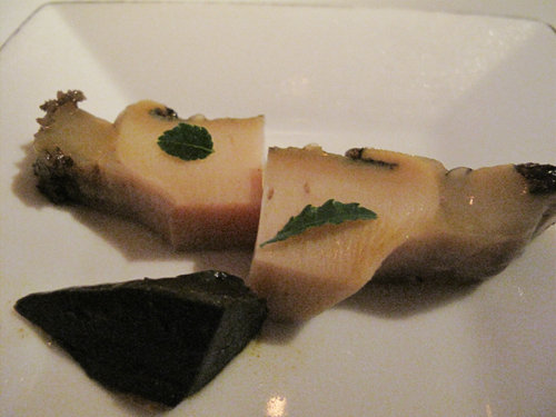 これは鮑の身と肝を低温調理したもので、生とも通常に火入れしたのとも違う食感。