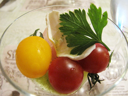 トマト・メロンの生ハム巻き・チーズ・バジルオイルソース。