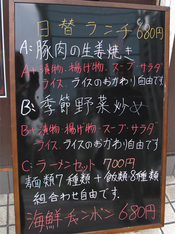 こちらは日替わり定食とレギュラーメニューにない海鮮チャンポンのメニューです。