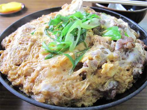 トンカツと海老天と牛肉を玉子でとじた丼です。