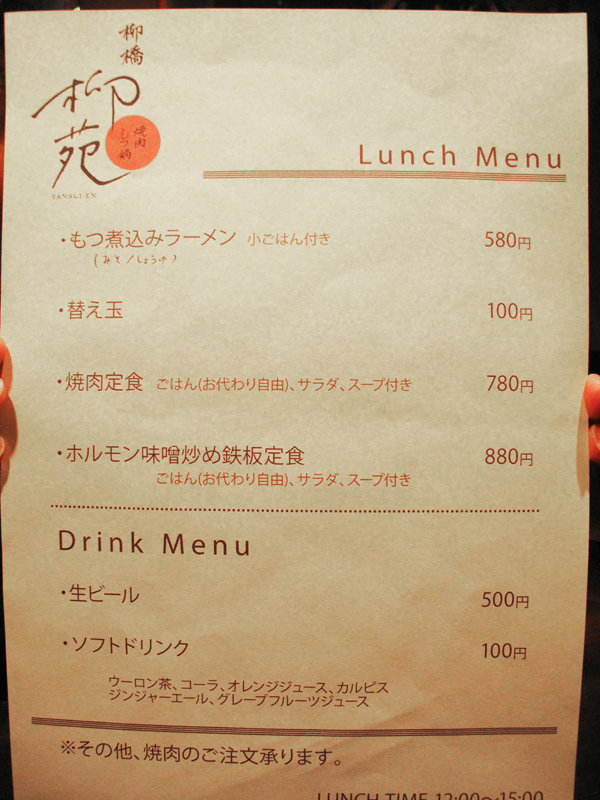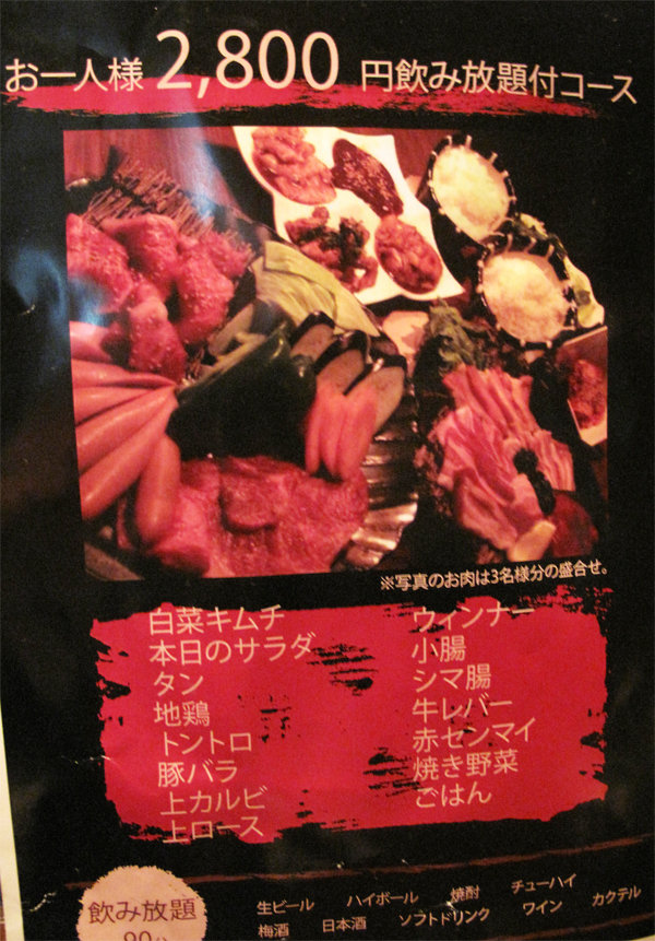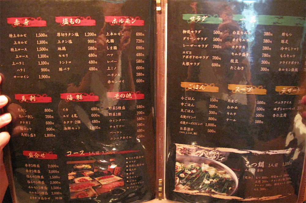 こちらは夜の焼肉とモツ鍋メニューですが、ランチでも注文可能です。