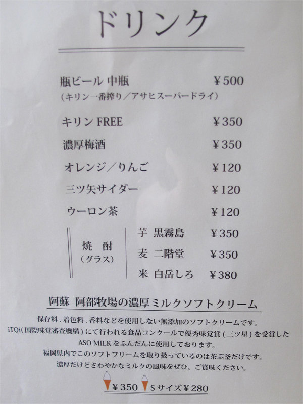 ドリンクと阿蘇牧場の濃厚ミルクソフトクリームのメニュー。