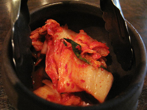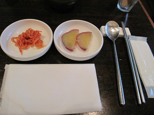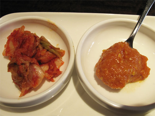 パンチャン(おかず)2種とおかわり自由のキムチ。