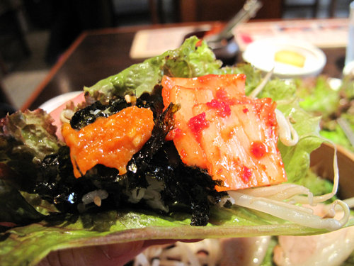 では、サニーレタスに適当にお肉や野菜、キムチや味噌を包んで頂きます。