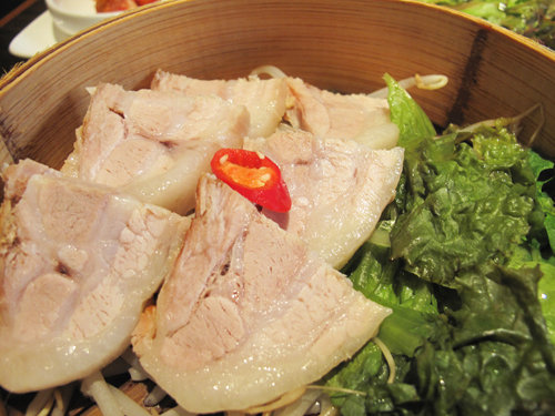 豚バラ肉をノンオイルで2時間蒸し上げたもの、をセイロで温め直したもの。