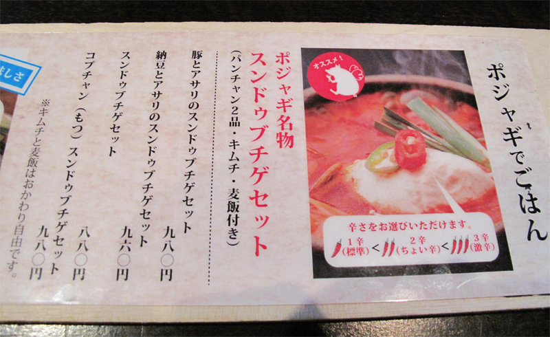 ポジャギ名物スンデゥブチゲセットのメニューです。