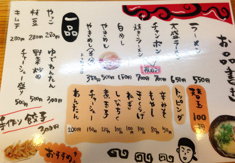 ラーメンなどの麺メニューとおつまみ料理のメニューです。